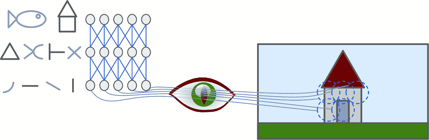 David H. Hubel 和 Torsten Wiesel 在 1958 年和 1959 年在猫的身上做了一系列研究,对视神经中枢做了研究(并在 1981 年荣获了诺贝尔生理学或医学奖)。特别的,他们指出视神经中的许多神经元都有一个局部感受野(local receptive field),也就是说,这些神经元只对有限视觉区域的刺激作反应(见图 14-1,五个神经元的局部感受野由虚线表示)。不同神经元的感受野或许是重合的,拼在一起就形成了完整的视觉区域。