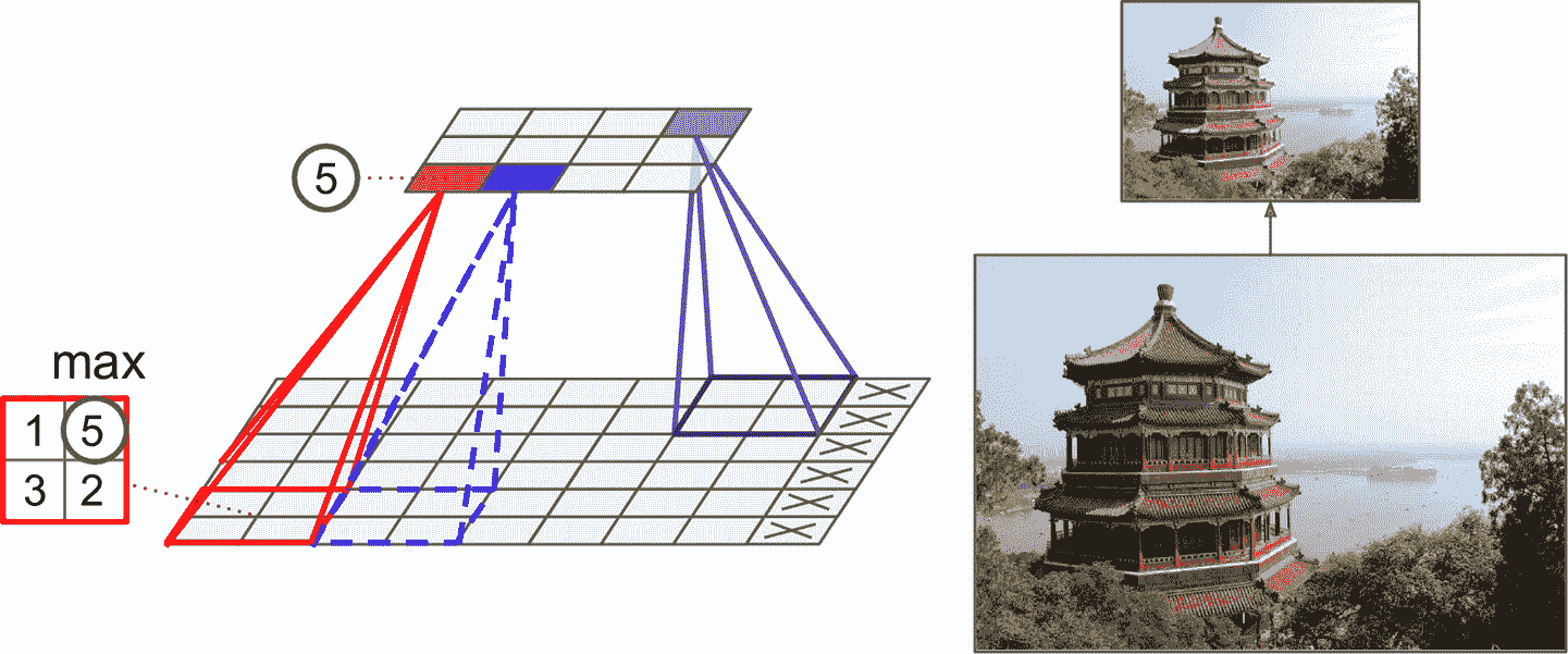 用 TensorFlow 实现最大池化层很简单。下面的代码实现了最大池化层,核是2 × 2。步长默认等于核的大小,所以步长是 2(水平和垂直步长都是 2)。默认使用"valid"填充: