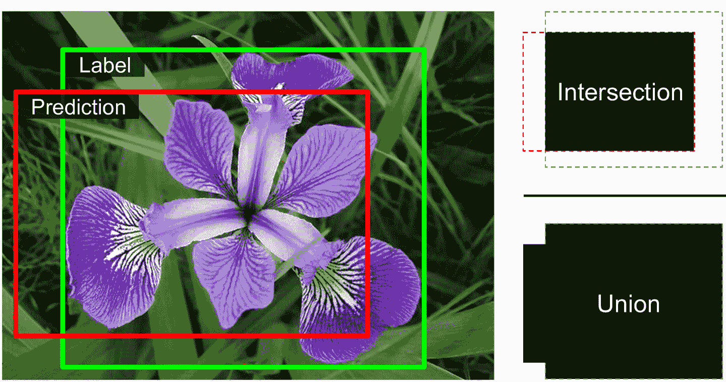 MSE 作为损失函数来训练模型效果很好,但不是评估模型预测边框的好指标。最常见的指标是交并比(Intersection over Union (IoU)):预测边框与目标边框的重叠部分,除以两者的并集(见图 14-23)。在tf.keras中,交并比是用tf.keras.metrics.MeanIoU类来实现的。