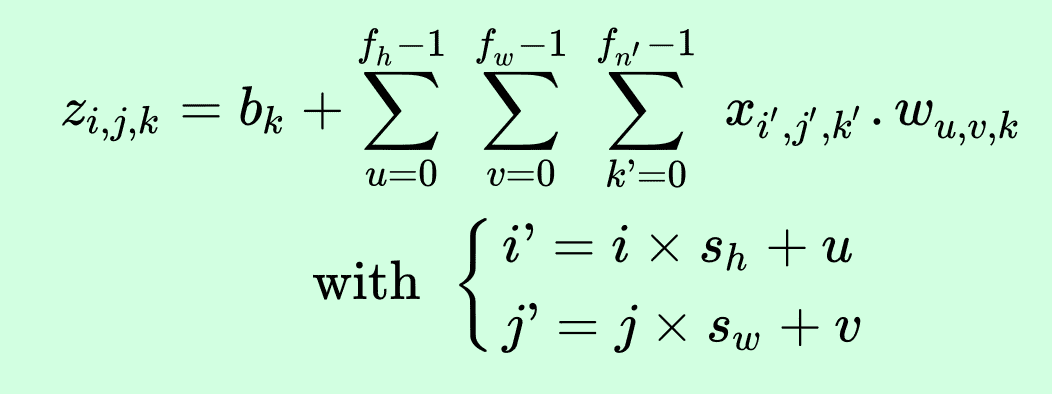 x[i', j', k']是卷积层l-1中第i'行、第j'列、特征映射k'的输出(如果前一层是输入层,则为通道k')。 -
