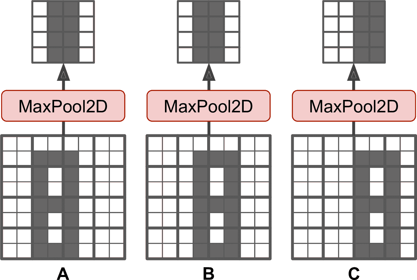 除了可以减少计算、内存消耗、参数数量,最大池化层还可以带来对小偏移的不变性,见图 14-9。假设亮像素比暗像素的值小,用2 × 2核、步长为 2 的最大池化层处理三张图(A、B、C)。图 B 和 C 的图案与 A 相同,只是分别向右移动了一个和两个像素。可以看到,A、B 经过池化层处理后的结果相同,这就是所谓的平移不变性。对于图片 C,输出有所不同:向右偏移了一个像素(但仍然有 50% 没变)。在 CNN 中每隔几层就插入一个最大池化层,可以带来更大程度的平移不变性。另外,最大池化层还能带来一定程度的旋转不变性和缩放不变性。当预测不需要考虑平移、旋转和缩放时,比如分类任务,不变性可以有一定益处。