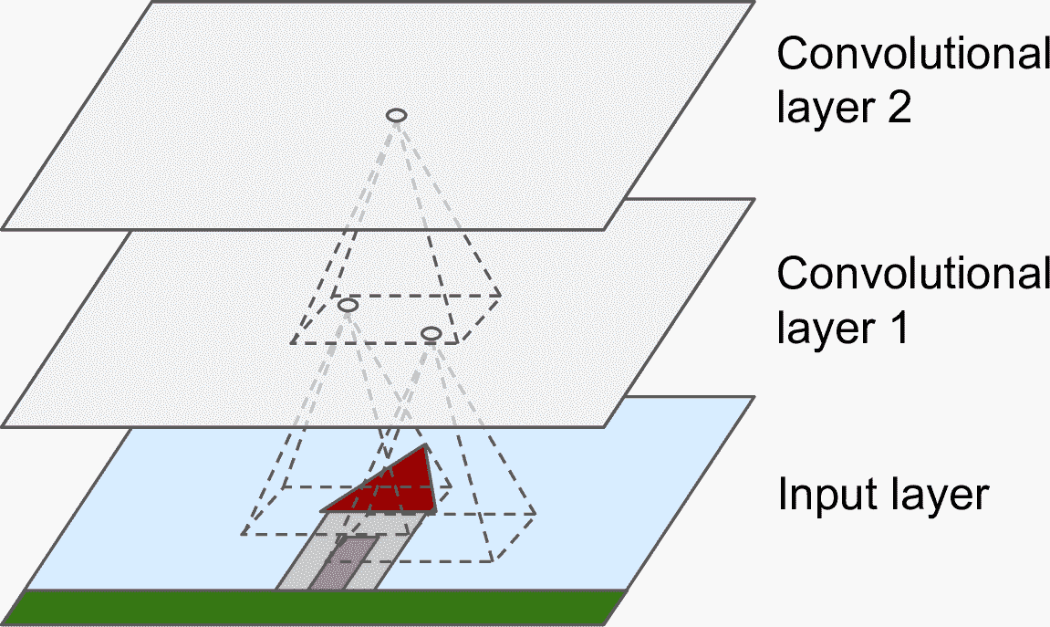 卷积层是 CNN 最重要的组成部分:第一个卷积层的神经元,不是与图片中的每个像素点都连接,而是只连着局部感受野的像素(见图 14-2)。同理,第二个卷积层中的每个神经元也只是连着第一层中一个小方形内的神经元。这种架构可以让第一个隐藏层聚焦于小的低级特征,然后在下一层组成大而高级的特征,等等。这种层级式的结构在真实世界的图片很常见,这是 CNN 能在图片识别上取得如此成功的原因之一。