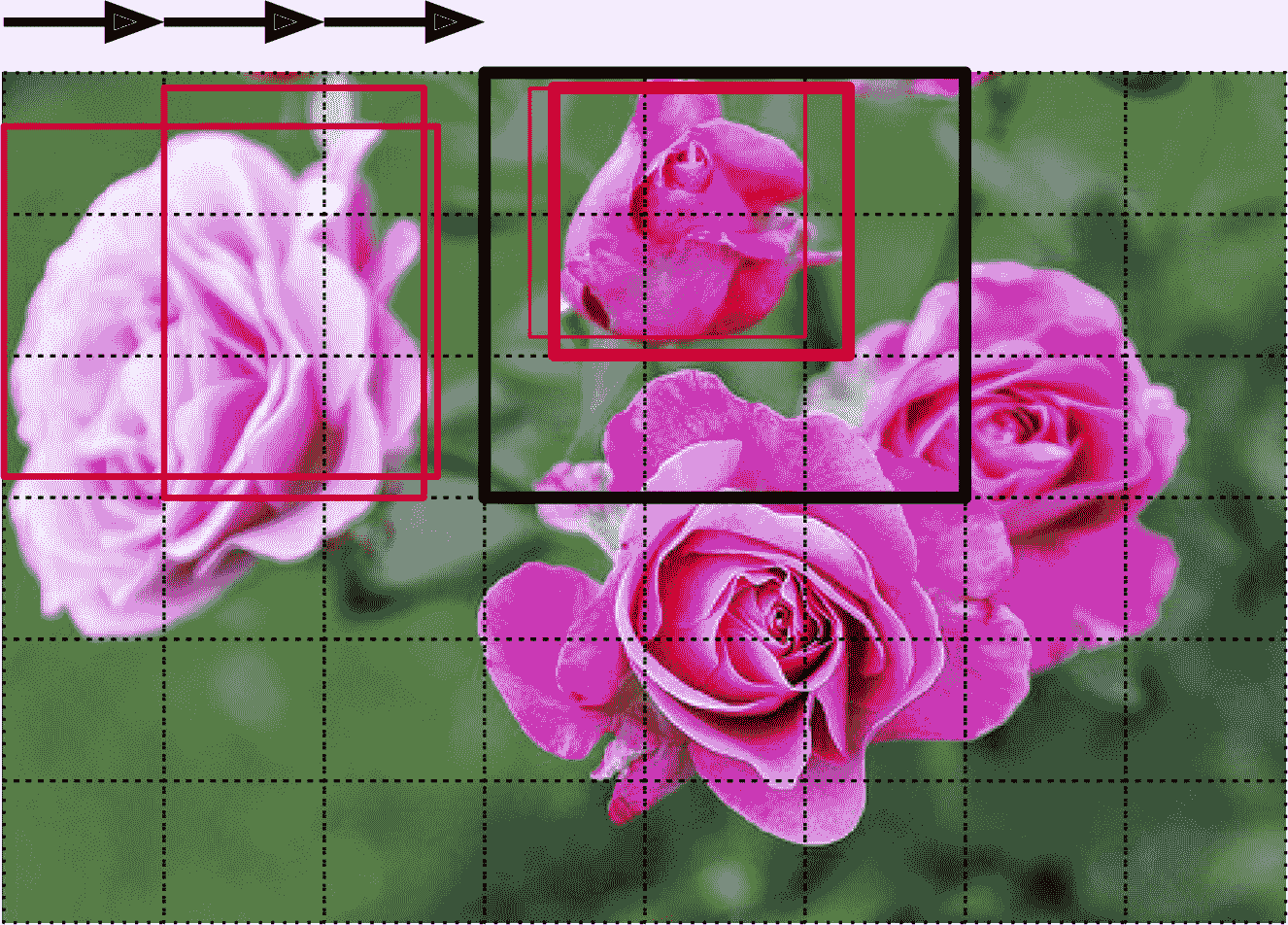 分类并定位图片中的多个物体的任务被称为目标检测。几年之前,使用的方法还是用定位单一目标的 CNN,然后将其在图片上滑动,见图 14-24。在这个例子中,图片被分成了6 × 8的网格,CNN(粗黑实线矩形)的范围是3 × 3。 当 CNN 查看图片的左上部分时,检测到了最左边的玫瑰花,向右滑动一格,检测到的还是同样的花。又滑动一格,检测到了最上的花,再向右一格,检测到的还是最上面的花。你可以继续滑动 CNN,查看所有6 × 8的区域。另外,因为目标的大小不同,还需要用不同大小的 CNN 来观察。例如,检测完了所有6 × 8的区域,可以继续用6 × 8的区域来检测。