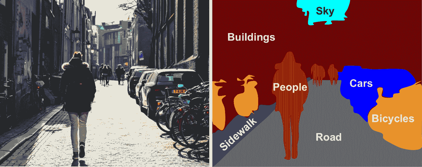 在语义分割中,每个像素根据其所属的目标来进行分类(例如,路、汽车、行人、建筑物,等等),见图 14-26。注意,相同类的不同目标是不做区分的。例如,分割图片的右侧的所有自行车被归类为一坨像素。这个任务的难点是当图片经过常规 CNN 时,会逐渐丢失空间分辨率(因为有的层的步长大于 1);因此,常规的 CNN 可以检测出图片的左下有一个人,但不知道准确的位置。
