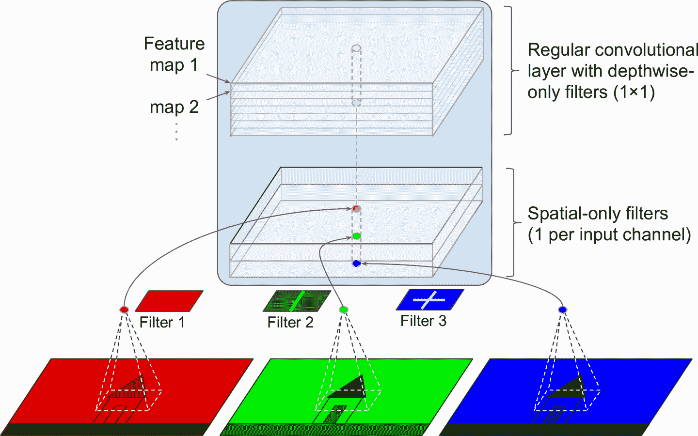 图 14-6 有多个特征映射的卷积层,有三个颜色通道的图像