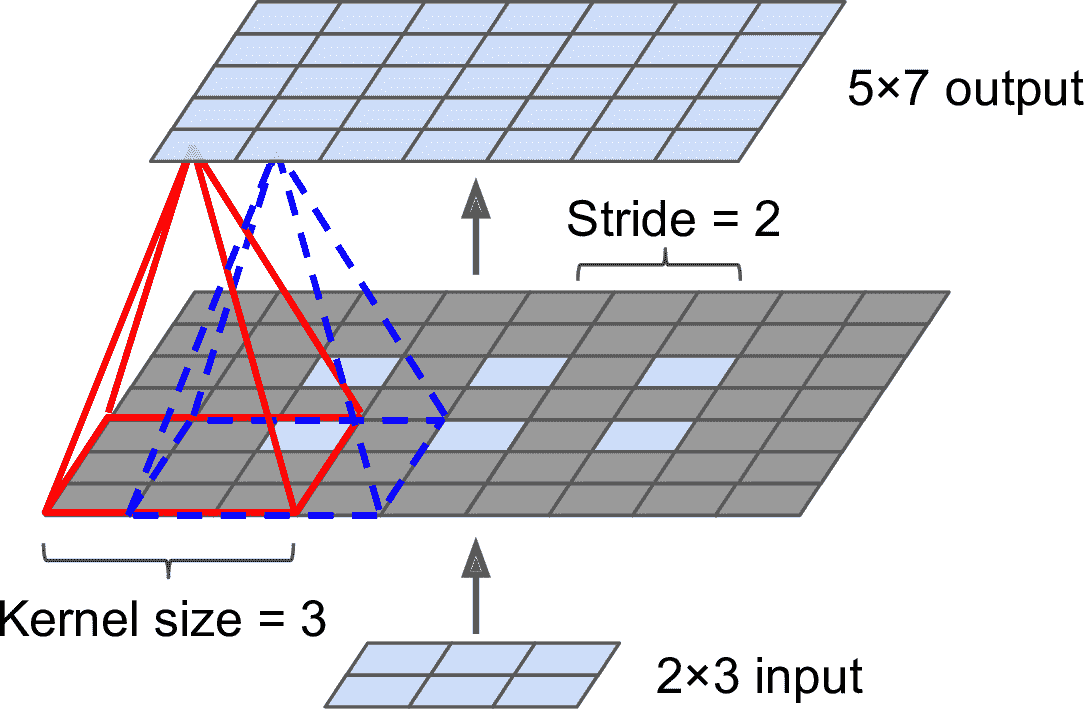 也可以通过间隔感受野,将大输入层和小卷积层连接起来,见图 14-4。这么做可以极大降低模型的计算复杂度。一个感受野到下一个感受野的便宜距离称为步长。在图中,5 × 7的输入层(加上零填充),连接着一个3 × 4的层,使用3 × 3的感受野,步长是 2(这个例子中,宽和高的步长都是 2,但也可以不同)。位于上层第i行、第j列的神经元,连接着前一层的第i × sh到i × sh + fh – 1行、第j × sw到j × sw + fw – 1列的神经元的输出,s[h]和s[w]分别是垂直和水平步长。