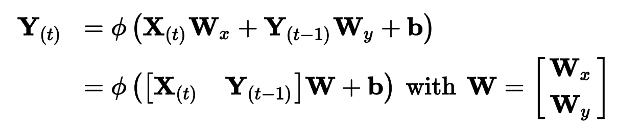 Y[t]是m × n_neurons矩阵,包含在小批次中每个实例在时间步t的层输出(m是小批次中的实例数,n_neurons是神经元数)。X[t]是m × n_inputs矩阵,包含所有实例的输入 (n_inputs是输入特征的数量)。W[x]是n_inputs × n_neurons矩阵,包含当前时间步的输入的连接权重。W[y]是n_neurons × n_neurons矩阵,包含上一个时间步的输出的连接权重。b是大小为n_neurons的向量,包含每个神经元的偏置项。- 权重矩阵