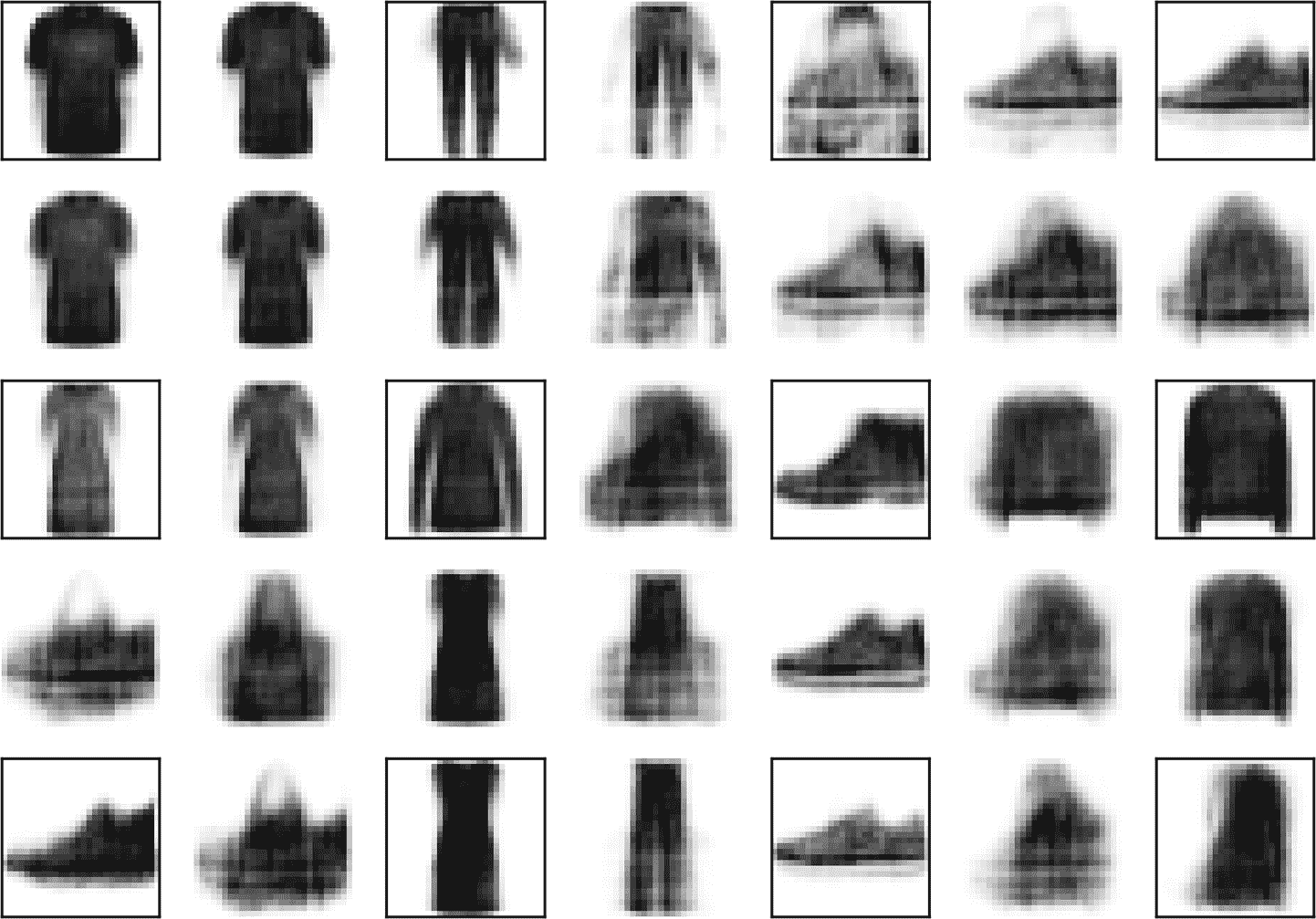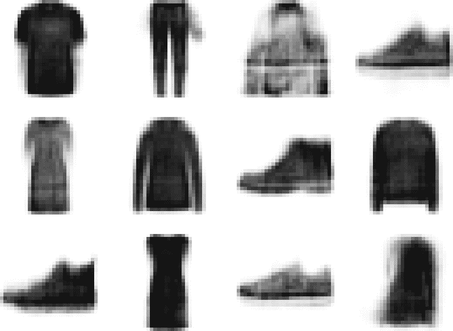 这样就好了!如果展示生成出来的图片(见图 17-16),可以看到在第一个周期的后期,图片看起来已经接近 Fashion MNIST 的图片了。