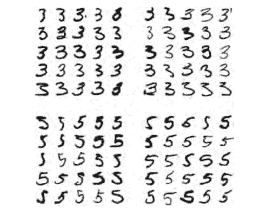 分析独特的误差,是获得关于你的分类器是如何工作及其为什么失败的洞见的一个好途径。但是这相对难和耗时。举例子,我们可以画出数字 3 和 5 的例子