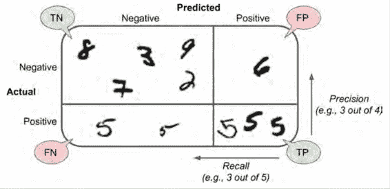 左边两个5*5的块将数字识别为 3,右边的将数字识别为 5。一些被分类器错误分类的数字(比如左下角和右上角的块)是书写地相当差,甚至让人类分类都会觉得很困难(比如第 8 行第 1 列的数字 5,看起来非常像数字 3 )。但是,大部分被误分类的数字,在我们看来都是显而易见的错误。很难明白为什么分类器会分错。原因是我们使用的简单的SGDClassifier,这是一个线性模型。它所做的全部工作就是分配一个类权重给每一个像素,然后当它看到一张新的图片,它就将加权的像素强度相加,每个类得到一个新的值。所以,因为 3 和 5 只有一小部分的像素有差异,这个模型很容易混淆它们。