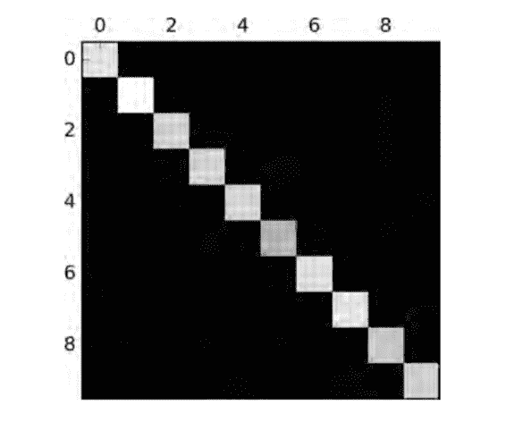 这里是一对数字。使用 Matplotlib 的matshow()函数,将混淆矩阵以图像的方式呈现,将会更加方便。