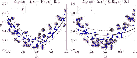 处理非线性回归任务,你可以使用核化的 SVM 模型。比如,图 5-11 显示了在随机二次方的训练集,使用二次方多项式核函数的 SVM 回归。左图是较小的正则化(即更大的C值),右图则是更大的正则化(即小的C值)