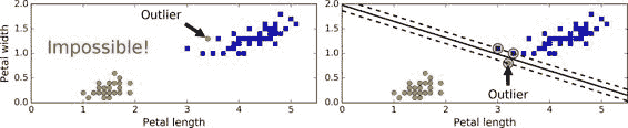 如果我们严格地规定所有的数据都不在“街道”上,都在正确地两边,称为硬间隔分类,硬间隔分类有两个问题,第一,只对线性可分的数据起作用,第二,对异常点敏感。图 5-3 显示了只有一个异常点的鸢尾花数据集:左边的图中很难找到硬间隔,右边的图中判定边界和我们之前在图 5-1 中没有异常点的判定边界非常不一样,它很难一般化。