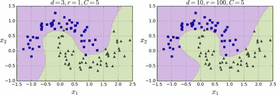 这段代码用 3 阶的多项式核训练了一个 SVM 分类器,即图 5-7 的左图。右图是使用了 10 阶的多项式核 SVM 分类器。很明显,如果你的模型过拟合,你可以减小多项式核的阶数。相反的,如果是欠拟合,你可以尝试增大它。超参数coef0控制了高阶多项式与低阶多项式对模型的影响。