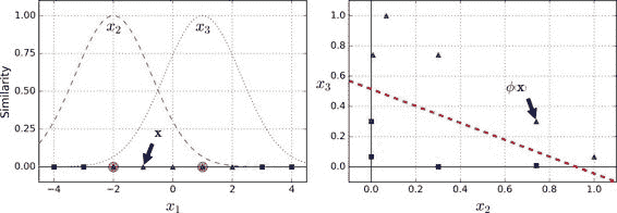 它是个从 0 到 1 的钟型函数,值为 0 的离地标很远,值为 1 的在地标上。现在我们准备计算新特征。例如,我们看一下样本x1=-1:它距离第一个地标距离是 1,距离第二个地标是 2。因此它的新特征为x2=exp(-0.3 × (1^2))≈0.74和x3=exp(-0.3 × (2^2))≈0.30。图 5-8 右边的图显示了特征转换后的数据集(删除了原始特征),正如你看到的,它现在是线性可分了。