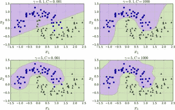 这个模型在图 5-9 的左下角表示。其他的图显示了用不同的超参数gamma (γ)和C训练的模型。增大γ使钟型曲线更窄(图 5-8 左图),导致每个样本的影响范围变得更小:即判定边界最终变得更不规则,在单个样本周围环绕。相反的,较小的γ值使钟型曲线更宽,样本有更大的影响范围,判定边界最终则更加平滑。所以γ是可调整的超参数:如果你的模型过拟合,你应该减小γ值,若欠拟合,则增大γ(与超参数C相似)。