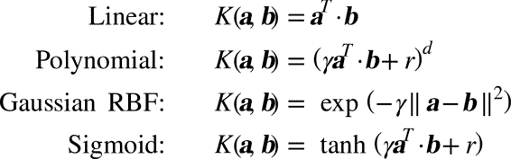 函数K(a, b) = (a^T b)^2被称为二次多项式核(polynomial kernel)。在机器学习,核函数是一个能计算点积的函数,并只基于原始向量a和b,不需要计算(甚至知道)转换ϕ。公式 5-10 列举了一些最常用的核函数。