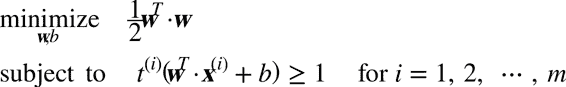 因此,我们可以将硬间隔线性 SVM 分类器表示为公式 5-3 中的约束优化问题
