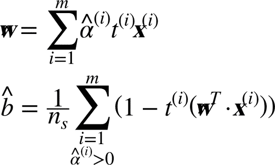 线性 SVM 分类器通过简单地计算决策函数w · x + b = w[1] x[1] + ... + w[n] x[n] + b来预测新样本的类别:如果结果是正的,预测类别ŷ是正类,为 1,否则他就是负类,为 0。见公式 5-2