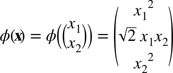 假设你想把一个 2 次多项式变换应用到二维空间的训练集(例如卫星数据集),然后在变换后的训练集上训练一个线性 SVM 分类器。公式 5-8 显示了你想应用的 2 次多项式映射函数ϕ。